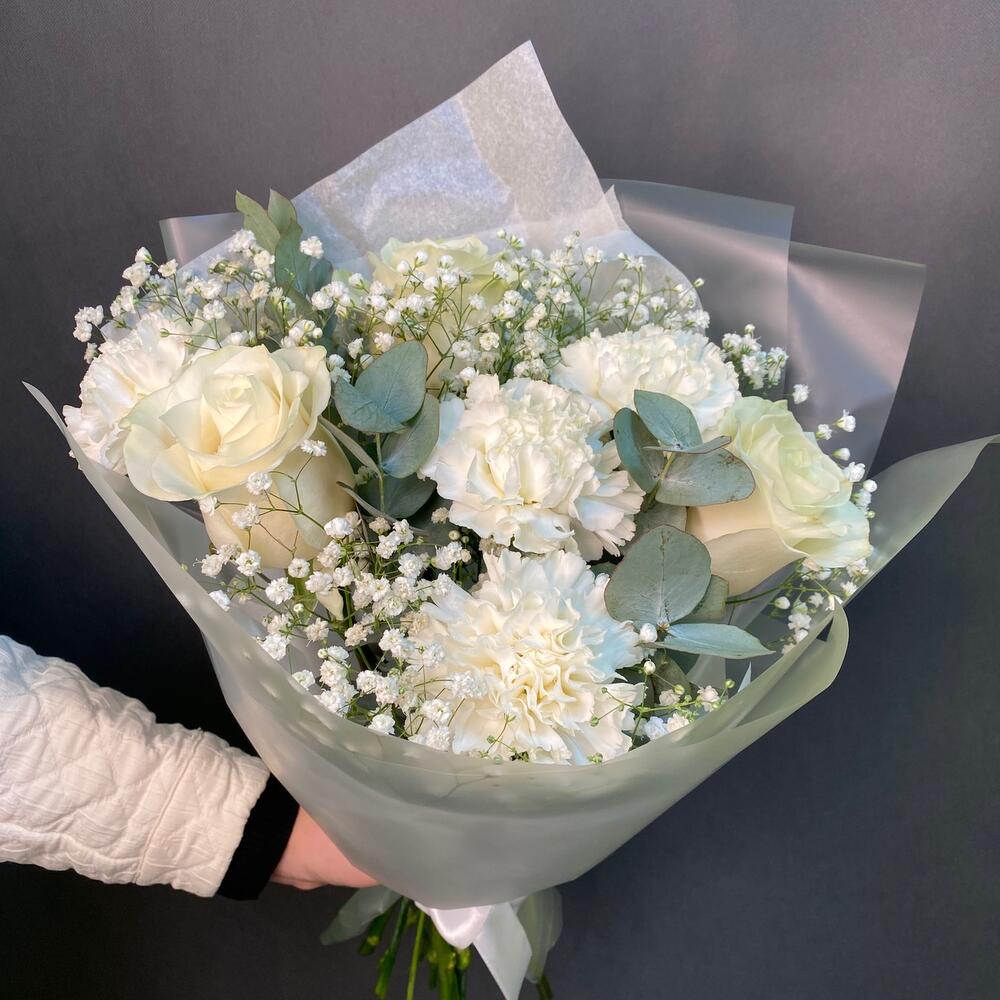 Упаковка дизайнерская – 4 шт.Роза Мондиаль – 3 шт.гипсофила белая ветка – 3 шт.диантус аврора – 4 шт.эвкалипт ценария ветка – 1 шт.