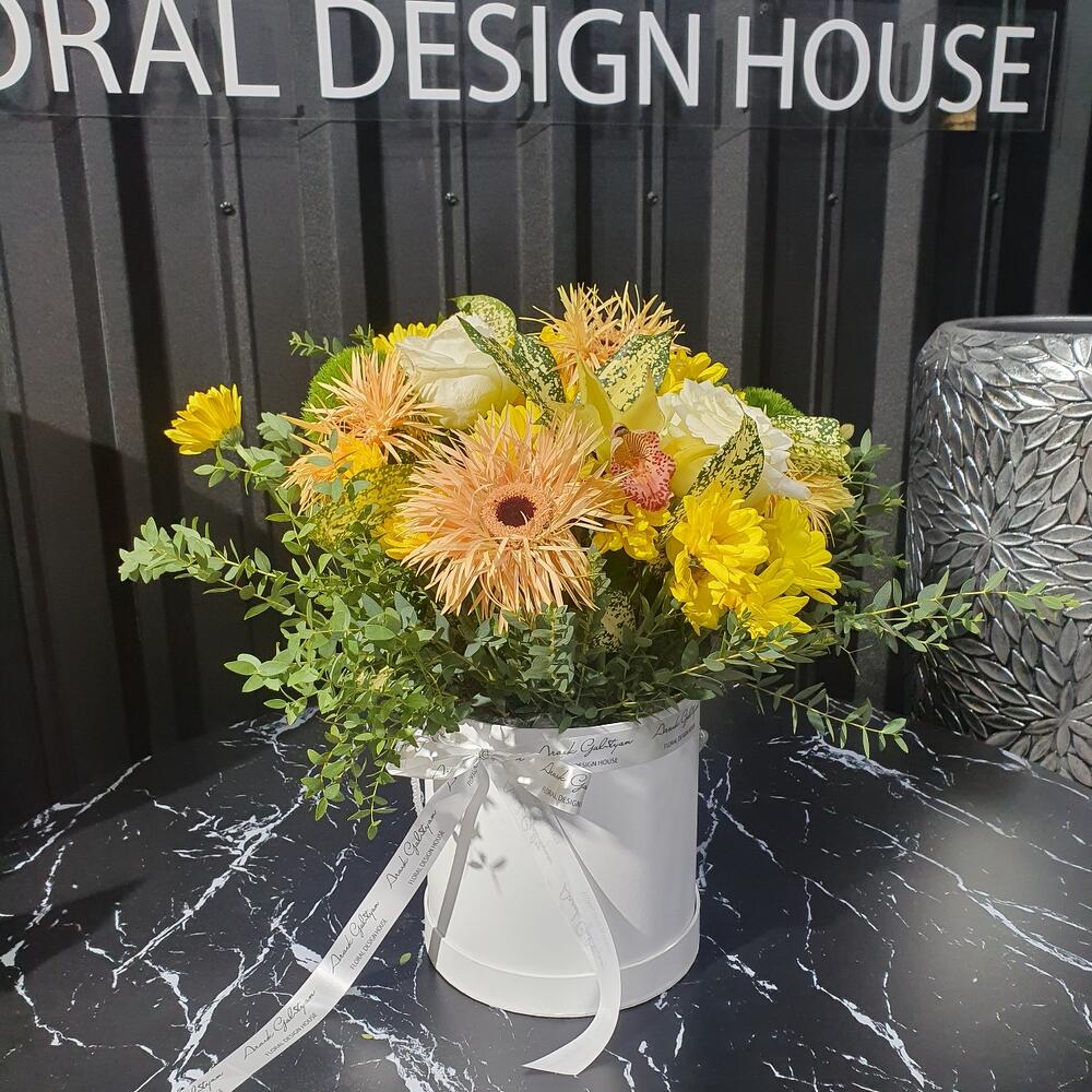 Гербера – 6 шт. Роза – 2 шт. Хризантема кустовая – 7 шт. зелень экзотика – 3 шт. Диантус – 3 шт. Орхидея Цимбидиум – 3 шт. Фисташка пучок – 3 шт. Оазис флористический – 1 шт. Коробка шляпная – 1 шт.
