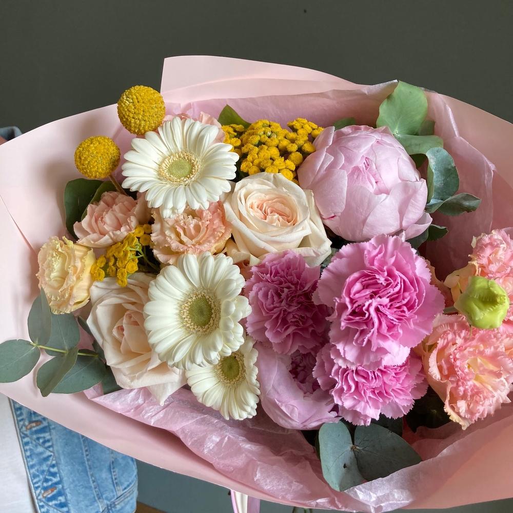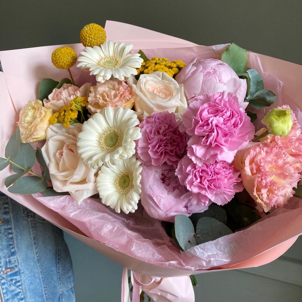 Букет в тёплых розовых, жёлтых и кремовых оттенках, с пионами, пионовидными розами, герберами, гвоздиками, лизиантусом, краспедией и эвкалиптом.Стильное цветочное решение для любого случая.