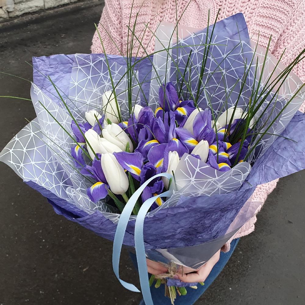 Тюльпан белый – 15 шт.Ирис Blue Magic – 10 шт.Берграсс – 1 шт.Лента атласная – 1 шт.