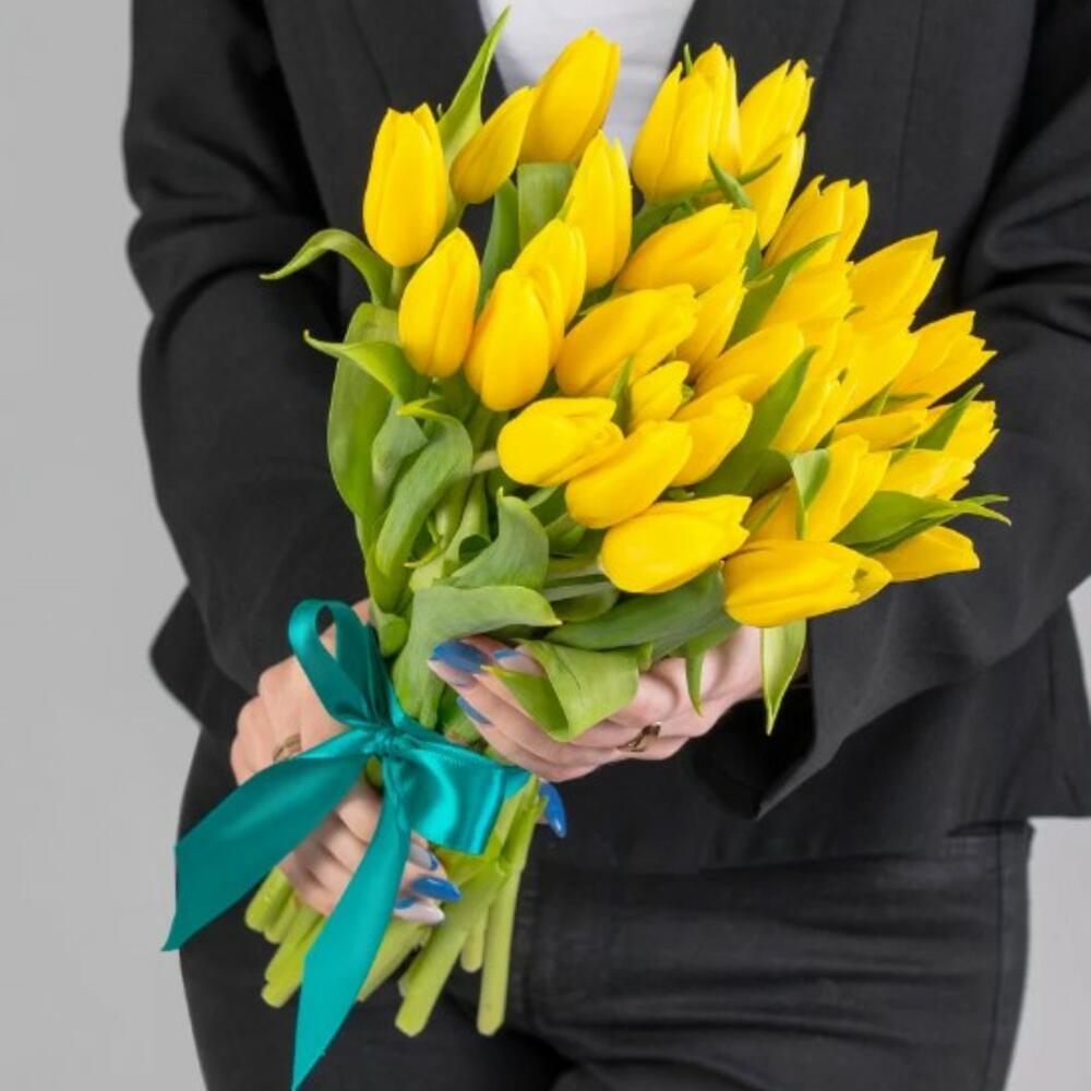 Тюльпан желтый – 35 шт.Атласная лента – 1 шт.