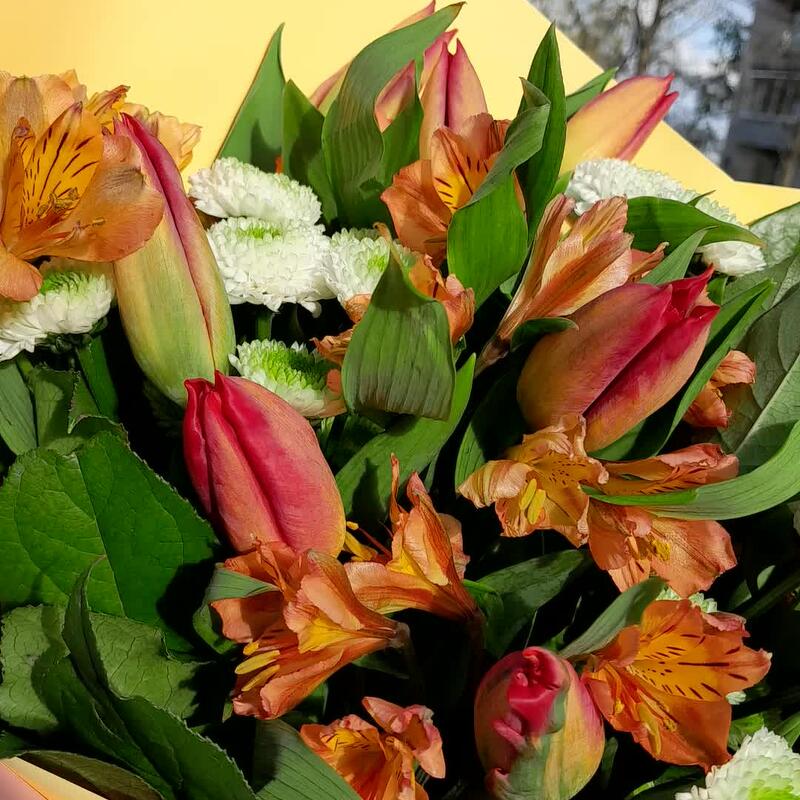 Букет из тюльпанов, альстромерии и сантини