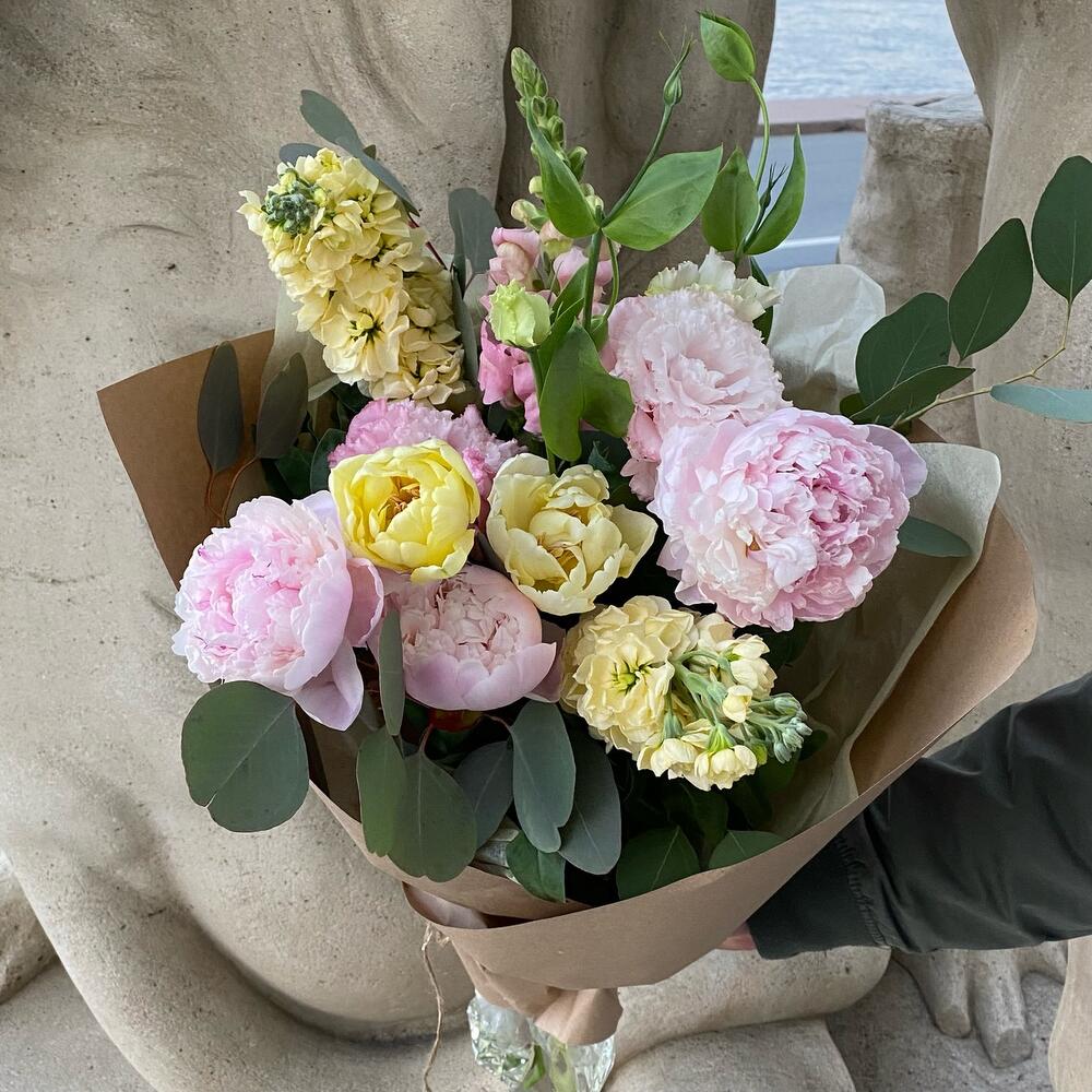 Пион – 3 шт.Маттиола – 2 шт.Львиный зев – 1 шт.Тюльпан махровый – 3 шт.Лизиантус – 1 шт.Эвкалипт – 3 шт.Упаковка – 1 шт.