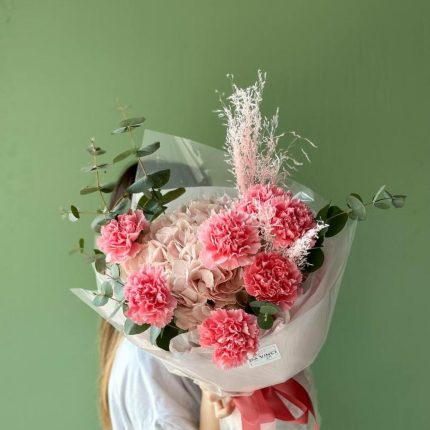 Евро-Букет из Гортензии ,Розовых Роз,Лизиантусов и Эвкалипта + открытка ручной работы в подарок